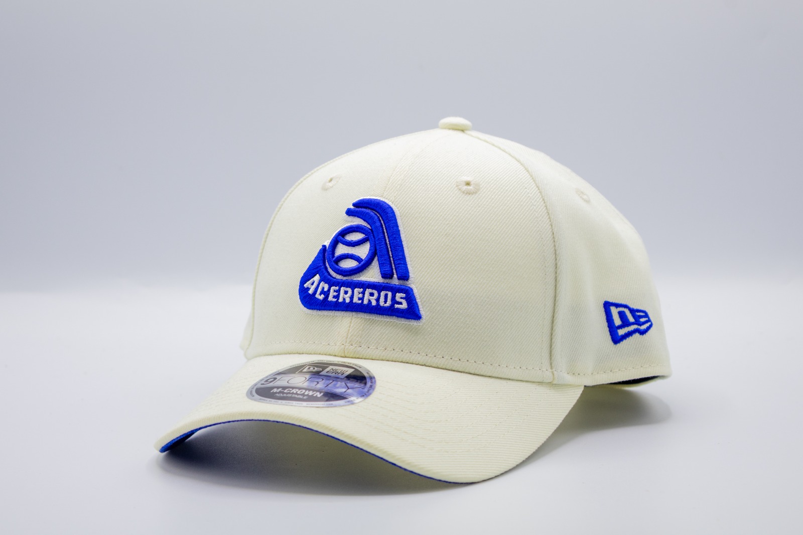 Gorra ajustable en tonalidad beige con logo retro en color azul.